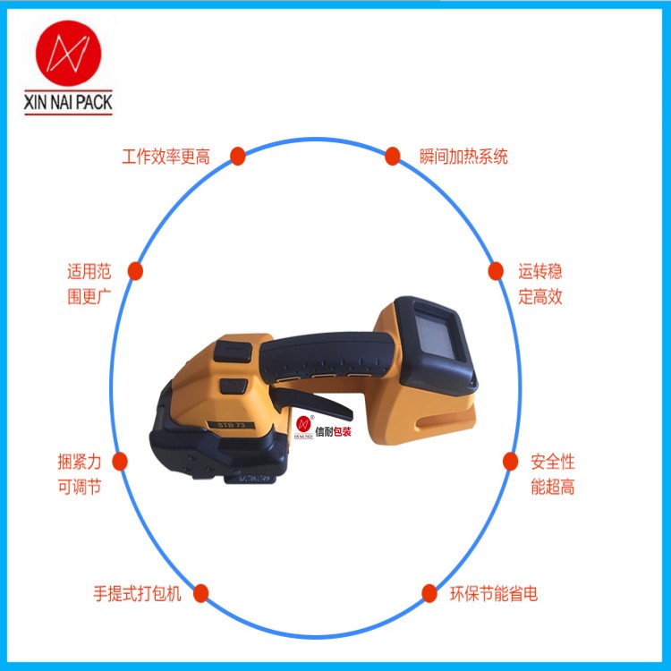 STB-73手提電動打包機、輕量化完美平衡,智能化設計:實時指示施加的拉伸力,電動控制的打包流程,打包帶對齊指示,直觀設計:,借助手指壓力進行控制的可變拉伸速度,帶有觸摸板校準的數字化用戶界面,打包功能收藏夾的科技型打包機。