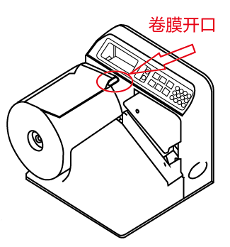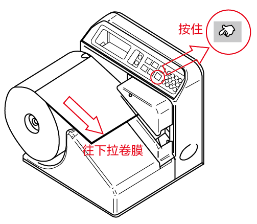 3)用手拉著卷膜進(jìn)氣孔完成進(jìn)入氣管頭后,直接穿入進(jìn)膜槽,然后,一手按著操作面板上黃色的“IN/OUT”(進(jìn)退膜)按鈕,另一手同時配合著將卷膜從槽內(nèi)拉出。